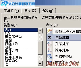 2. 选择“命令”选项,在“类别”框中单击“表格”,在“命令”框中找到并单击“自动求和”,然后用左键将它拖放到常用工具栏中的适当位置。