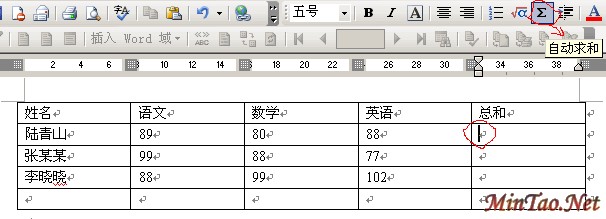 如上图,把插入点置于存放求和的单元格中,单击常用工具栏中的〔自动求和〕按钮,则Word将计算并显示插入点所在的上方单元格中或左方单元格中数值的总和。当上方和左方都有数据时,上方求和优先。