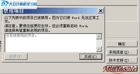 若解决不了问题,请执行第二种操作: 1、单击“帮助”菜单中“关于Microsoft Office Word”; 2、点击“禁用项目”按钮; 3、选中希望重新启用的项目,单击“启用”按钮;
