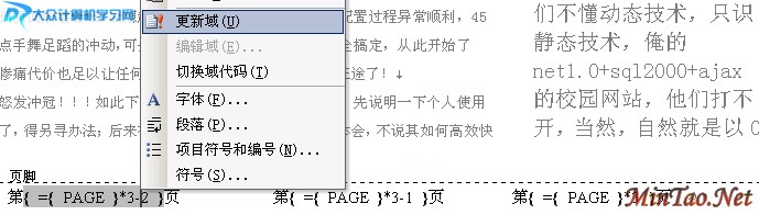 设置好了之后,暂时是无法看到页码显示的,要想查看页码,如下图,首先选择编辑好的插入域中的命令,插入域被选中之后,底色是浅黑色的,这个时候,点击右键,弹出快捷菜单,执行“更新域”;