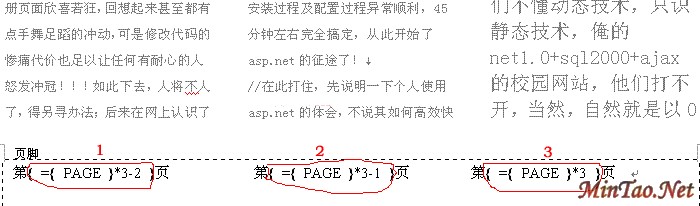 上述命令中,为什么第几页的命令是{ PAGE }*3-2呢,因为一个页面显示三个页码,其中PAGE是当前页面所显示的页码,如果是第1页,那么,他的值就等于{ 1 }*3-2,显示的就是1,同理,在上图中的2位置,其值即为{ 1 }*3-1,显示2,而3位置为{ 1 }*3,显示为3,保证显示页码的正确性,这是按照需要通过逻辑算法计算出来的,新手得好好琢磨琢磨这种逻辑关系了!