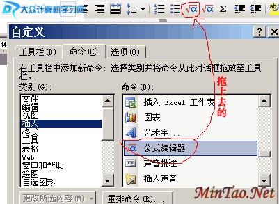 对于常用的命令,我们也先介绍一下其按钮的添加方法,如,添加公式编辑器,首先执行“工具”→“自定义”,弹出如下对话框,按下图方法操作即可!