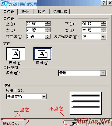 根据需要,设置好页面设置环境之后,如果需要保存,以方便下次直接调用而不用重新设置,那么,我们可点击“默认”按钮,注意,不是“确定”按钮,小心了哦,别弄错拉!
