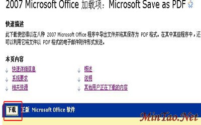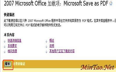 在这里值得一提的是,office2007自身没有这项功能,我们先要到微软公司office2007的下载网站(http://office.microsoft.com/zh-cn/downloads/CD101950462052.aspx)下载这个插件(如图1)。下载一个名为“2007 Microsoft Office 加载项:Microsoft Save as PDF ”的插件。 点击进入此加载项的下载页面时,微软公司要进行验证。你点击“验证”按钮后(如图2),会弹出一个验证插件安装提示,点击安装,验证后便可以下载此插件了(如图3)。