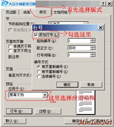 ①:首先选择“版式”页框; ②:在“预览”的下面选择应用范围,分为三种:分别是本节、插入点之后和整篇文档,有这三种应用范围,根据需要自己选择其中一个就行了! ③:点击“行号”按钮,弹出“行号”对话框,把“添加行号”前面的选项框的√选中即可!