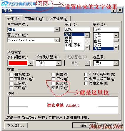 在WORD中设置字符呈现出凸出来或者凹进去的效果(这很少使用,但是在特殊场合非用不可),操作其实很简单,下面简单做一个介绍: 首先选择要设置如此效果的字符,然后执行如下操作: “格式”→“字体”,弹字体对话框: 如下图: 阳文刻的字是凸出来的,阴文刻的字是凹进去的。如果使用阳文印章,印到纸上就是白底黑字,非常醒目。
