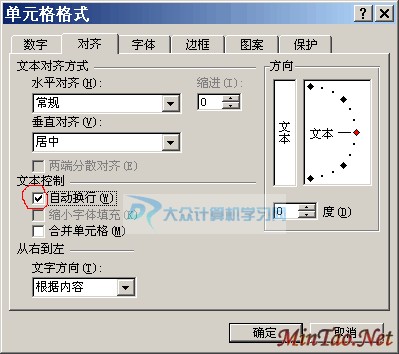 上图中,切换到“对齐”选项卡,之后在“文本控制”下面将“自动换行”前面的√打上,“确定”退出即可!