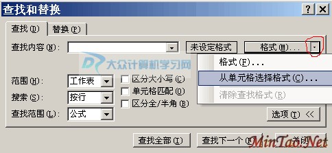 现在,点击“格式”按钮右边的方向朝下的箭头,从菜单中点击“从单元格选择格式”,这个时候,会进入单元格的选择状态,移动鼠标到背景颜色为“绿色”的任何一个单元格里面中左键点击一下,然后会自动返回对话框!