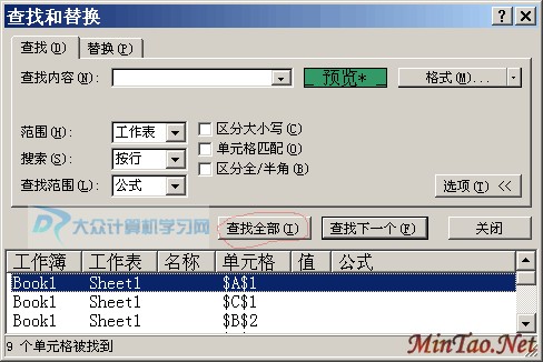 最后,我们点击“查找全部”按钮,这个时候,就能在对话框的最下面,看到已统计的个数了,如“9个单元格被找到”。