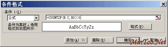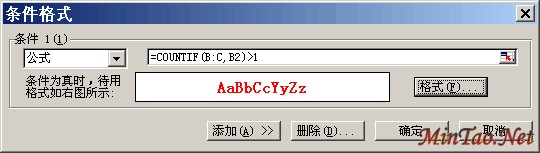 上图中,在“条件1”那里选择“公式”,之后在其右方输入如上图一样的公式代码,即 =COUNTIF(B:C,B2)>1 ,然后,点击格式按钮,弹出如下图的条件设置。