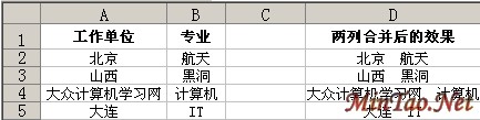当然,大众通常都使用函数“CONCATENATE”合并两列数据。只要在目标单元格中输入“=CONCATENATE(A2,B2)”,就可以把A2与B2两个单元格内的数据合并到一个单元格中,但这种合并的结果是将原单元格内容无间隙合并的,即结果是“大众计算机学习网计算机”,而我们要达到的效果是“大众计算机学习网 计算机”,工作单位与专业之间加上空格。如何得到这样的结果呢?