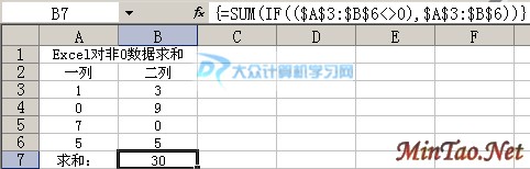 如上图,首先在B7单元格对应的FX函数输入框里面,直接输入“=SUM(IF(($A$3:$B$6<>0),$A$3:$B$6))”,注意哦,不带引号;