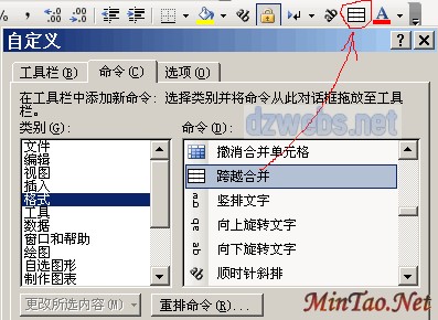 上图中,选择“命令”选项卡,在类别中找到“格式”,在其右方的“命令”列表中找到“跨越合并”,然后,像上图一样,使用鼠标左键拖动“跨越合并”图标,将其拖放到工具栏中。