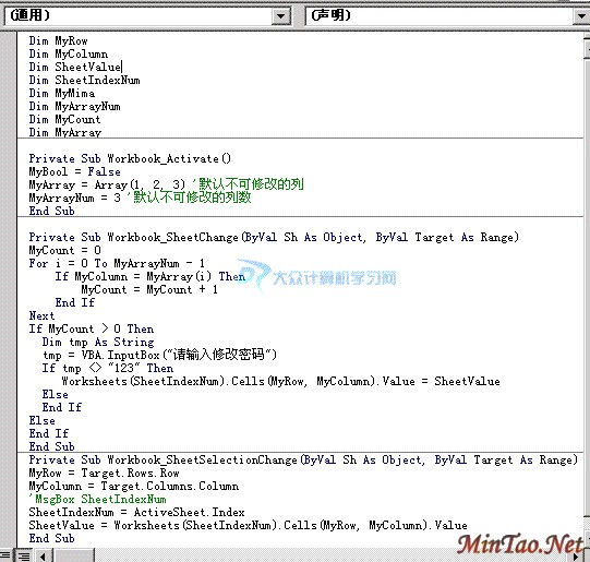 上述代码实现的功能是:无论您当前的工作薄有多少个工作表,无论您的工作表中有多少条数据,如果要修改被限制的列的数据,则需要输入密码,密码正确则可以修改,密码错误则无法修改!在不能修改数据的前提下,不弹出任何提示信息,仅将修改后的数据恢复到原来没有修改的状态,实现禁止修改列数据的目的!