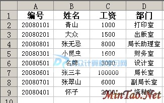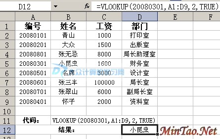 2,代表返回第2列的数据;如果改为“=VLOOKUP(20080301,A1:D9,3,TRUE)”,返回的是第3列的数据,即工资,对应于20080301编号的工资,就是1600;如果3改为4,则返回的值应该是“财务室”;
