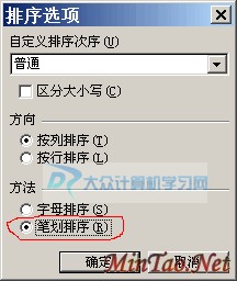 上图中,我们先在“自定义排序次序”列表中选择“普通”;最后在方法下面选中“笔划排序”!