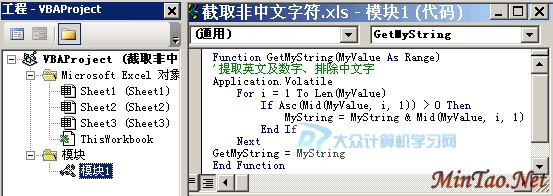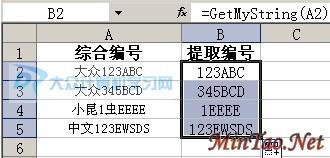 Function GetMyString(MyValue As Range) '提取英文及数字、排除中文字 Application.Volatile For i = 1 To Len(MyValue) If Asc(Mid(MyValue, i, 1)) > 0 Then MyString = MyString & Mid(MyValue, i, 1) End If Next GetMyString = MyString End Function