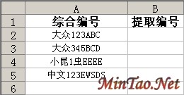 首先我们看下图,只有两列,前者为复杂的编号列,而第二列为想要提取的字符的编号存放列!