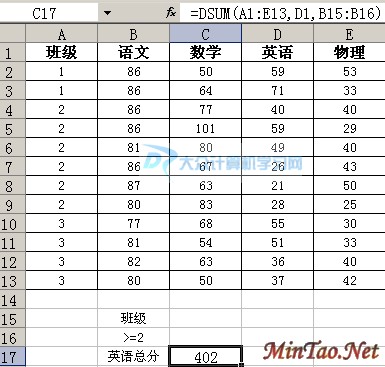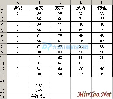 上表为一成绩表,里面均为测试数据!本例我们要求的结果是,在B17单元格中求取2、3班的英语成绩总分!