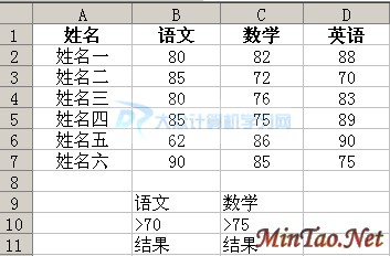 另外,求取大于70分的语文成绩的个数,其代码为:=DCOUNT(A1:D7,"语文",B9:B10)