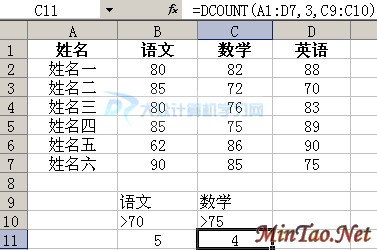 求耳大于75分的数学成绩的个数,其代码还可以为:=DCOUNT(A1:D7,“数学“,C9:C10),而图例中的代码则为=DCOUNT(A1:D7,3,C9:C10),大家注意到了没有,第二个参数即可以为列的序号,亦可以为列的字符,其灵活性是比较大的;