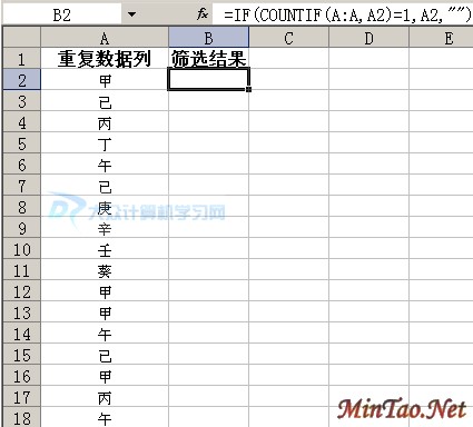 上图中,首先选择B2单元格,之后在FX函数输入框中输入如上图的函数代码即可!代码为:=IF(COUNTIF(A:A,A2)=1,A2,"");