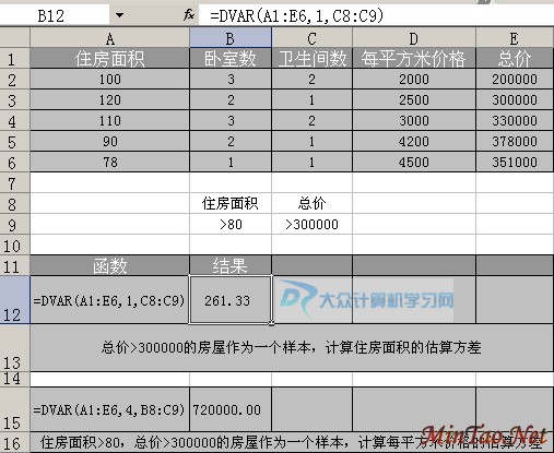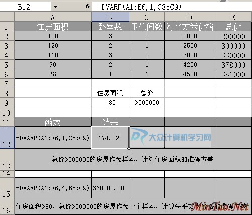 函数功能:将列表或数据库的列中满足指定条件的数字作为样本总体,计算总体的方差。