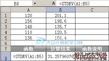 语法:STDEVA(value1,value2,...) 参数:Value1,value2,...是作为总体样本的1到30 个参数。可以使用逗号分隔参数的形式,也可以使用单一数组,即对数组单元格的引用。