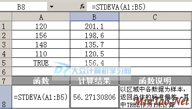 函数功能:计算基于给定样本的标准偏差,标准偏差反映数值相对于平均值(mean) 的离散程度。它与STDEV函数的区别是文本值和逻辑值(TRUE或FALSE)也将参与计算。