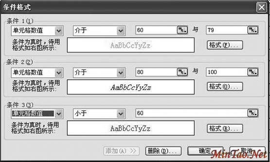 选定所有录入学生成绩的单元格,进入“格式→条件格式”,在“单元格数值”范围中填入“80”与“100”,单击“格式”按钮,将单元格数值 设置为自己喜欢的格式:如数值颜色为蓝色、字形为倾斜等,这样,在80到100之间的分数在输入后自动变为蓝色并倾斜。确定,返回条件格式对话框,单击 “添加”,设置60到79、小于60分等分数段的格式(见图1)。