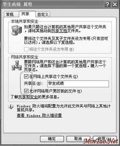在局域网中的一台电脑上新建一个Excel文档,命名为“学生综合成绩表”,设置好格式后存入一个专门的“学生成绩”文件夹,右击从快捷菜单 中选择共享,弹出图3所示文件夹属性对话框,在共享标签中找到“网络共享和安全”,在“共享名”框中输入“学生成绩”(名称可任意),注意在图中圈中的两 个复选框中必须都打上钩,设置好后,录入成绩的教师就能在任何一台联网微机上打开此综合成绩表。