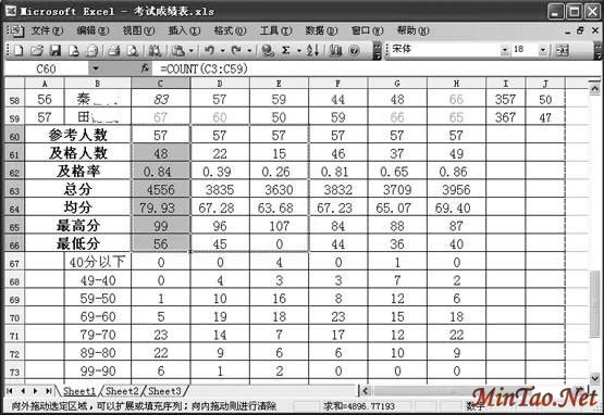 可用FREQUENCY函数来实现。在(A67:A74)区域输入39、49、59、69、79、89、99、109(即统计出40分以下 ~120分范围内组距为10的各分数段人数),同时选中c67至c75单元格区域,输入公式:=FREQUENCY(C3:C59,$A$67:$A $74),按下“Ctrl+Shift+Enter”组合键进行确认,即可求出c67至c75区域中,按A67: A74区域进行分隔的各段数值的出现频率数目。其他单元格可用自动填充功能实现。