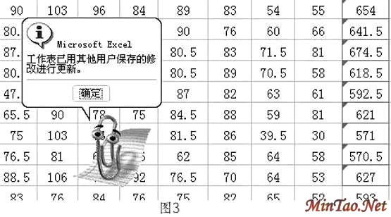 最后,所有录入成绩的教师从各自电脑上打开“网上邻居”,找到学生综合成绩表所在的计算机名称、共享文件夹名称——“学生成绩”(如果设置了 密码,要告诉大家),打开学生综合成绩表,按学科、班级录入各自的成绩,并注意随时存盘,存盘时会有如图4所示提示。若单元格被其他用户更改,在单元格中 会有批注提示用户,可防止数据冲突。使用此法,能充分利用现有电脑及教师资源,提高效率。