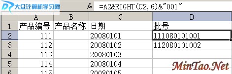 首先,选择D2单元格,在其函数输入的地方输入:=A2&RIGHT(C2,6)&"001",并按回车确认,得到如下图的结果!