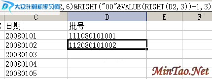选中D3单元格,在其函数输入的地方输入=A3&RIGHT(C2,6)&RIGHT("00"&VALUE(RIGHT(D2,3))+1,3),并按回车确认,得到如下图的结果!