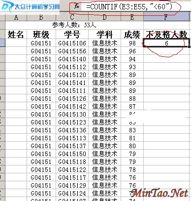 如下图,首先,选择F列中的F3单元格,之后,在其上方fx函数输入区域,直接输入=COUNTIF(E3:E55,“<60“),之后按回车键确认,这样,就得到不及格的人数了!