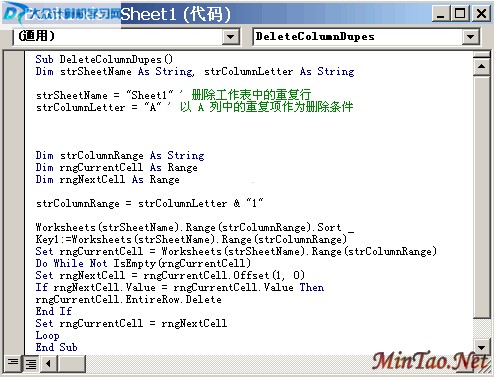 strSheetName = "Sheet1" ' 删除工作表中的重复行 strColumnLetter = "A" ' 以 A 列中的重复项作为删除条件