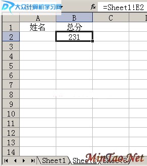 如下图,选择Sheet2中的B2单元格,之后在fx右边输入框中直接输入=Sheet1!E2,之后直接按回车键确认,这个时候,Sheet2中的B2显示的数据即为Sheet1中E2的值了,要想显示Sheet1中总分的其他单元格的数据到Sheet2对应的单元格,这个时候,直接使用自动填充功能即可!