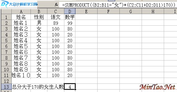 如下图,首先在选择D13单元格,之后在窗口中找到 fx 函数输入区域,并在其输入框内输入=SUMPRODUCT((B2:B11="女")*(C2:C11+D2:D11>170)),之后直接按回车键确认,即可得结果!