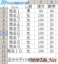 针对上图,我们要实现的结果是:求语文+数学的总分大于170的女生人数;