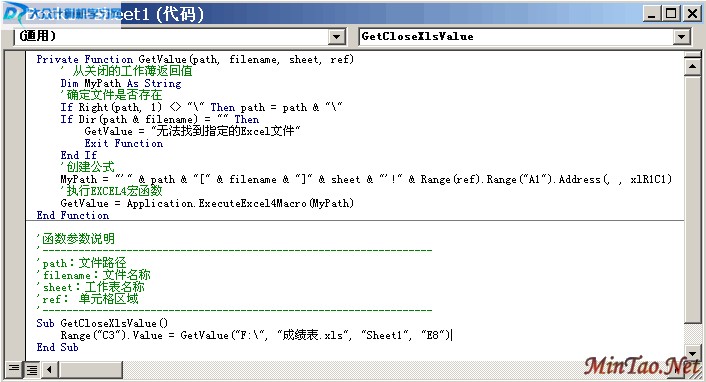 '函数参数说明 '----------------------------------------------------------------- 'path:文件路径 'filename:文件名称 'sheet:工作表名称 'ref: 单元格区域 '----------------------------------------------------------------- Sub GetCloseXlsValue() Range("C3").Value = GetValue("F:\", "成绩表.xls", "Sheet1", "E8") End Sub
