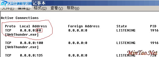 上图中,通过观察,不难发现,占用80端口的既然是Web迅雷,毛的啊,就是它惹的祸!