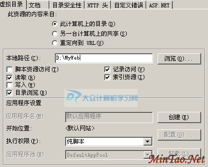 上图中,切换到“虚拟目录”选项卡;注意哦,这里的操作非常关键,很多网站不能运行,均与此操作脱不了干系!看到了吗,在灰暗的“应用程序名”后面有一个“创建”按钮,请您点击此按钮,创建一个应用程序名!创建好的应用程序名,可进行删除再创建,分别进行多次的操作,保证已创建一个名称!至于为什么要这么做,俺也说不清楚,不过就俺个人而言,遇到ASP.NET程序无法运行,都是这么操作的,都是这样来解决问题的!