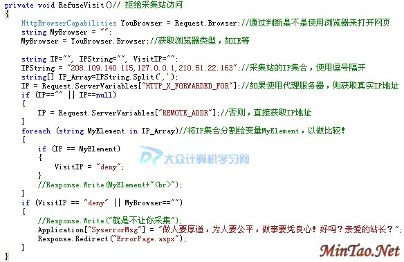 ②通过域名得知采集站的IP,将其收集起来,然后判断网页访客的IP是否是采集站的IP,如果是,将不能打开网页而进入错误提示的页面!(采集站的IP,只能通过平时观察以收集而获取,难得有点大!)