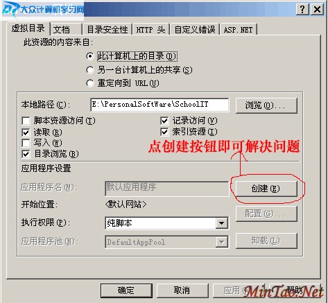 之后,选择“虚拟目录”选项卡,在灰暗的“应用程序名”右边那里找到“创建”按钮,点一下,问题就解决了!