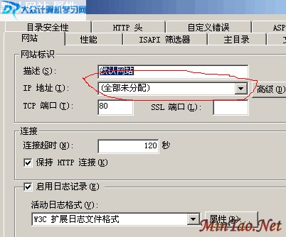 打开你的IIS,找到默认网站,点右键,执行“属性”操作,弹出上图的对话框,将IP地址设置为“全部未分配”;