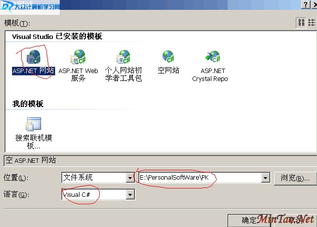 如果是要开发网站项目,就如上图般,选择“asp.net 网站”;之后,选择一种开发语言,如本例的C#,并选择好网站项目的存储位置!