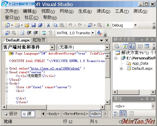 如上图,就建立好了一个网站项目,同时,该项目默认新建一个名为“Defatlt.aspx”的网页文件,专业术语称为“窗体”;