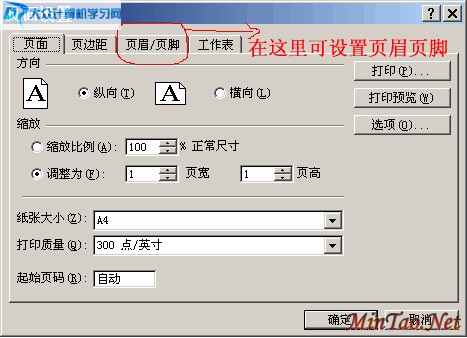 ③:如果想在打印过程中增加页码,那么,就选择“页眉/页脚”选框,到里面进行设置就行了!
