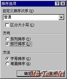 有时我们的表需要按照行来排序,这在Excel中也可以实现:打开“排序”对话框,单击“选项”按钮,打开“排序选项”对话框,这里可以设置排序的次序、方向、方法、是否区分大小写等,我们选择方向为“按行排序”,单击“确定”按钮,我们看“主要关键字”下拉列表框中的内容就发生了变化;不过由于在这里不能正确识别标题列,所以单击“确定”按钮后的排序会出现一些问题,这种情况下最好先选中要排序的单元格,然后再进行排序。(如上右图)